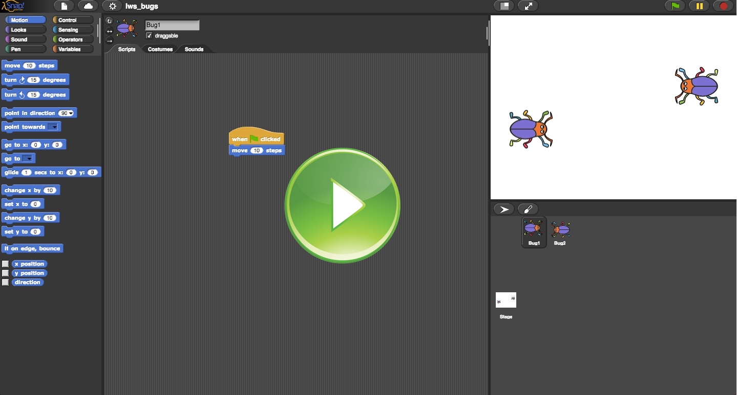 To play with Snap! you can just click on the play button on some of the images, like the one above. If you have any problems with it loading, visit Snap! directly in a new browser tab (On that page, click "Run Snap! now"). Another possible solution, if your browser is not Chrome, is to give Chrome a try.