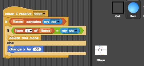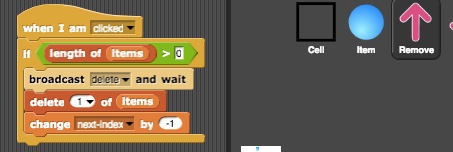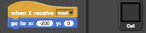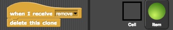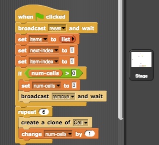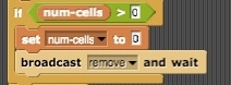 If the variable num-cells is not zero, it means we had previously set the stage. We broadcast the message remove to tell sprites to delete themselves. Let's see who is listening for that message. Looks like both