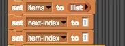 Going back to the Stage script, the next few tiles set the initial value for the variables items (an empty list), next-index (), and item-next ():