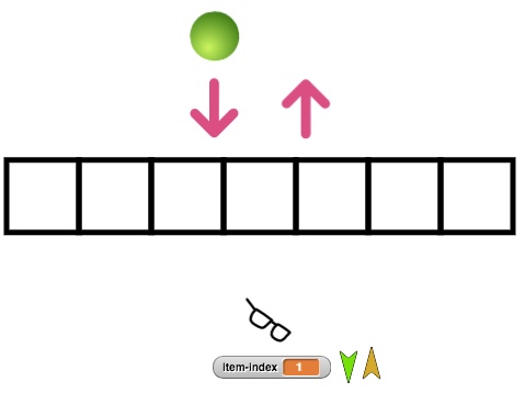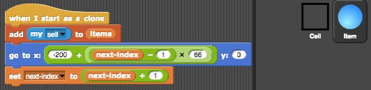 We can see that we are using the next-index variable to keep track of the index of the next available square. Again, some arithmetic will give us the coordinates of where the ball should be placed. We also make sure to increment the next-index by 1, so that the next ball will be placed in the cell one position to the right of this one. Finally, notice that we are adding this ball to the list variable items. Next we will see how this variable is used.