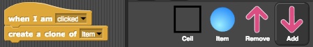 You can see I'm using a number of variables. But there we see a new kind of tiles that have to do with an idea called Message Broadcasts. Any thing (sprite) can at any time broadcast a message to all existing things. All things are also able to listen for, receive, and respond to a broadcast, identified by the message. In our script here, we can see a reset message and a remove message broadcast by the Stage. Therefore there must be some sprites that respond to these. Can you identify which ones receive which?