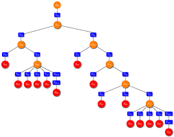 In the tree above, each colored shape represents a node in the tree. The top node is called the root node. Each node can have one or more children, to which it connects to in the level below via links. A node at the bottom of the tree has no children, and is called a leaf. The children of a node plus all nodes connected to them are called the descendants or subtree of that node.